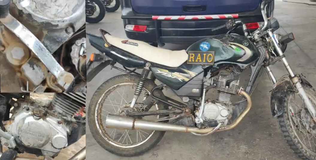 Uma motocicleta com evidências de adulteração foi apreendida neste sábado (14), por volta das 10h, no Loteamento Tamboril Ville, bairro Vila São Pedro. A equipe do Raio, durante patrulhamento, encontrou o veículo em situação de abandono e constatou uma irregularidade incomum: o motor da motocicleta, originalmente da marca Yamaha, havia sido substituído por um motor da marca Honda, cuja numeração estava suprimida.