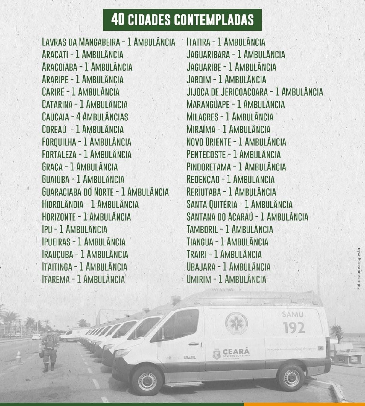 No estado do Ceará, 40 novas ambulâncias foram destinadas os municípios, incluindo Tamboril. A entrega desses veículos faz parte das ações comemorativas aos 20 anos do Samu no Brasil e visa fortalecer a capacidade de atendimento de urgência e emergência no estado.