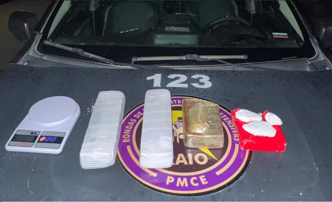 Na varredura realizada ao redor da residência, os policiais encontraram uma mochila escondida dentro de um galão de tinta, oculto sob arbustos na parte de trás do imóvel. Ao verificar o conteúdo, foram apreendidos aproximadamente 554 gramas de cocaína, 815 gramas de crack e 1.559 gramas de maconha, além de uma balança de precisão, instrumento comumente utilizado para fracionamento de drogas.