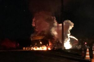 Um caminhão carregado de botijões de gás de cozinha pegou fogo e ficou totalmente destruído na noite desta segunda-feira (11), em frente ao posto da Polícia...